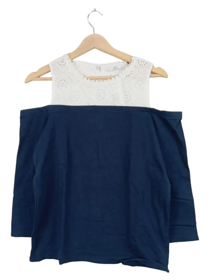Damen Top Off-Shoulder Lochstickerei Blau Weiß Gr. M