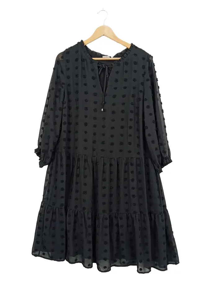 Damen Tunikakleid Gr. 42/XL Schwarz Chiffon Punkte Rüschen