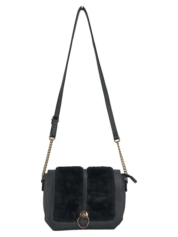 Damen Umhängetasche Schwarz Fell-Optik Gold-Details Elegant