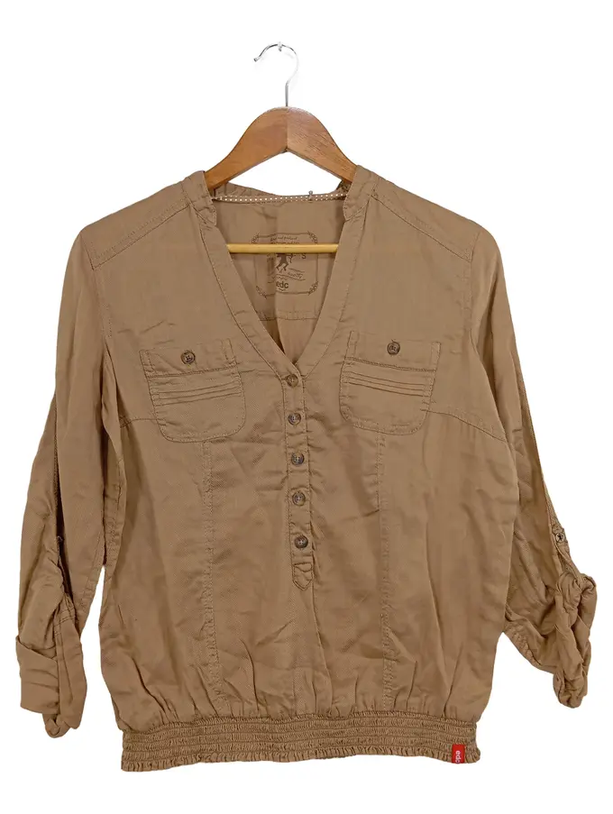 EDC Bluse 3/4-Arm Fischgrätenmuster Beige Baumwolle Gr. 36/S