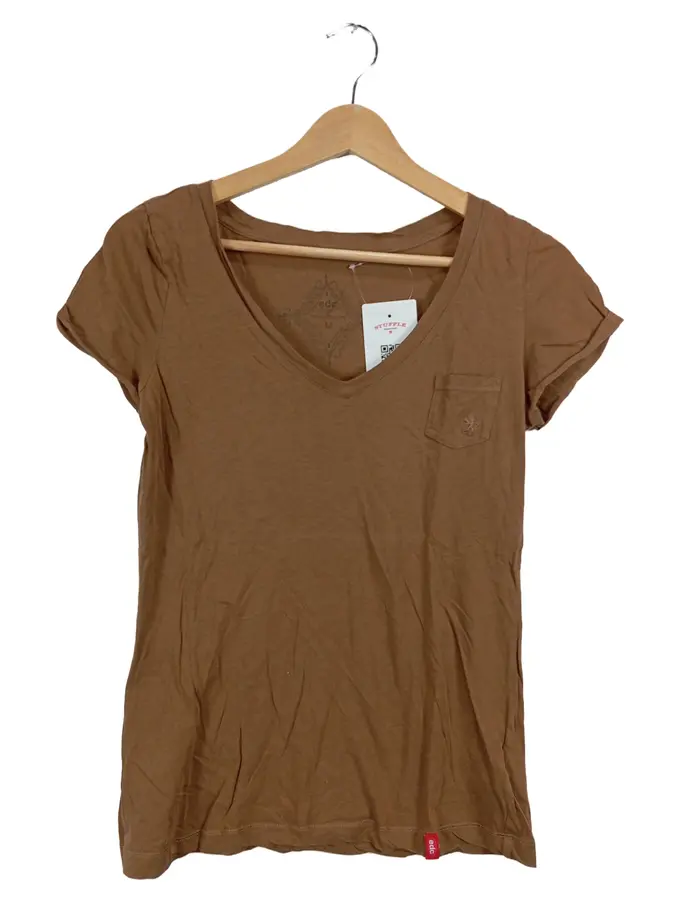 edc Damen T-Shirt Baumwolle Uni V-Ausschnitt Kurzarm Braun Gr. M