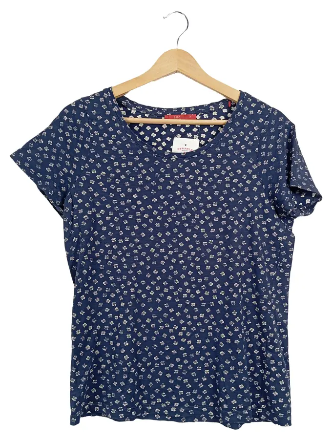 EDC Damen T-Shirt Gr. 38 Blau mit Blumenmuster Casual Kurzarm Shirt