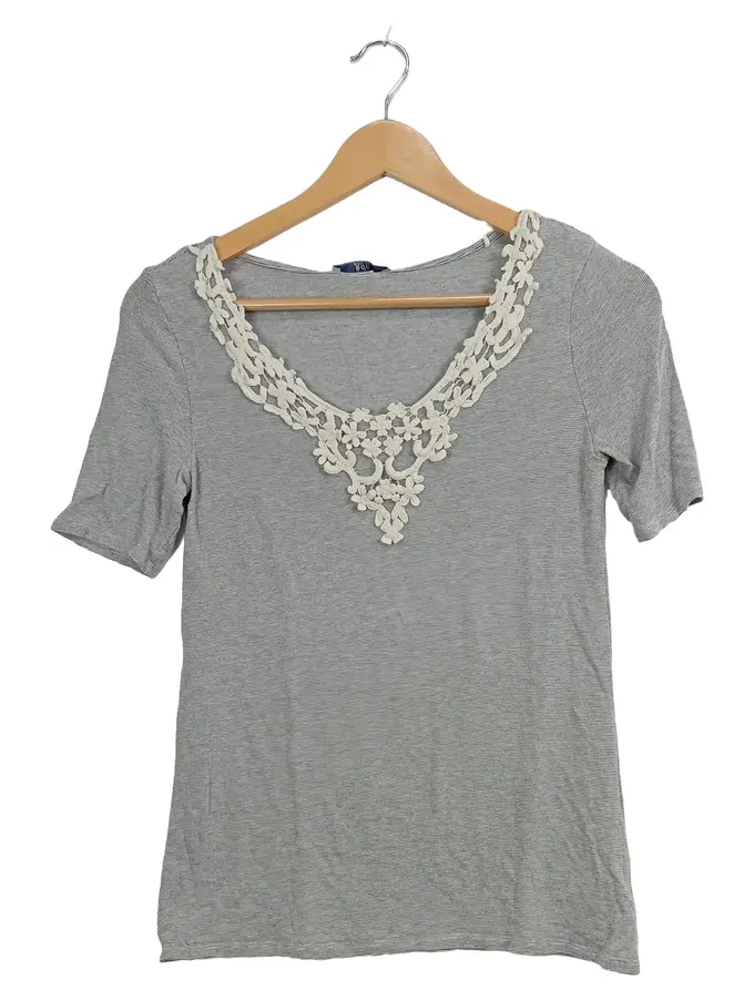 EDC Damen T-Shirt Grau Gestreift Häkelkragen XS