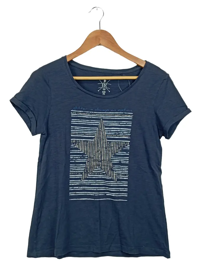 EDC Damen T-Shirt Stern Motiv Blau Gr. 34/XS Baumwolle Casual