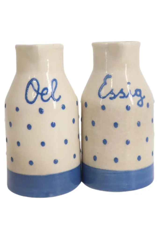 Essig Öl Dosierer Set Keramik Weiß Blau Punkte Vintage 2-teilig