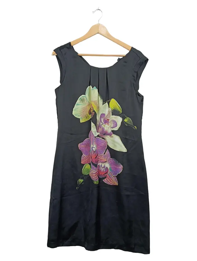 Etuikleid Damen Gr. 38 Schwarz Orchideen Blumenmuster Elegant