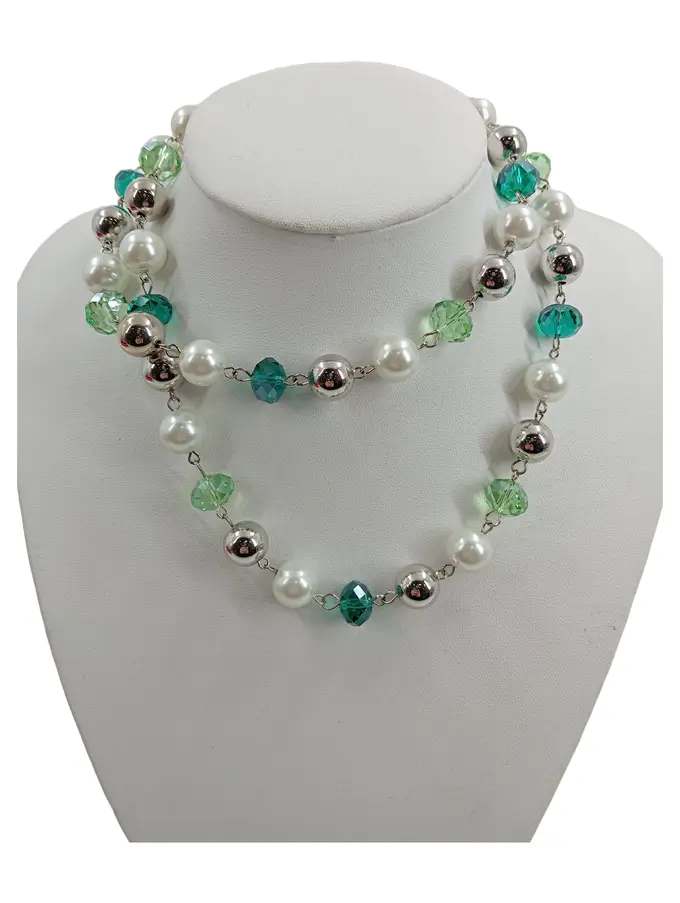 Halskette Perlen Kristalle Grün Türkis Silber Elegant Damen 39cm