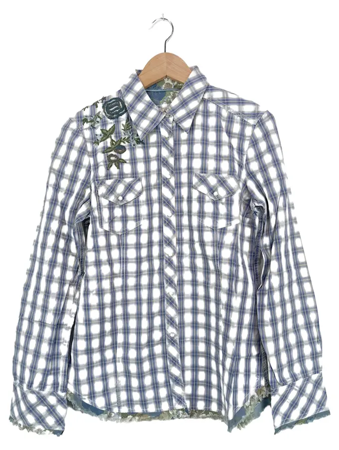 Hemdbluse Damen Kariert Langarm Stickerei Fransen Baumwolle 40 L