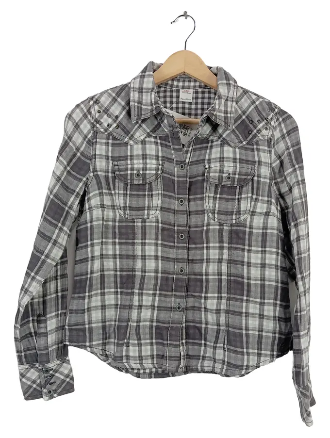 Hemdbluse Mädchen Gr. 164 Kariert Grau Langarm Nieten