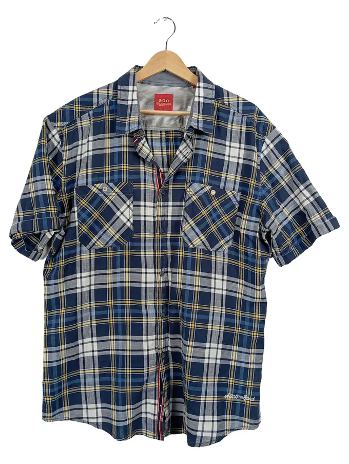 Herren Karohemd Kurzarm Blau Gelb Weiß Gr. XL Baumwolle