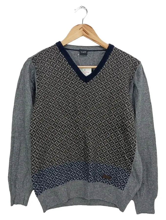 Herren Pullover Gr. 48/M Grau Casual Grafisches Muster V-Ausschnitt