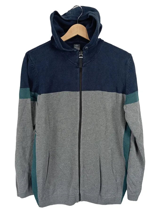 Herren Strickjacke Kapuze Gr. L Grau Blau Baumwolle Hoodie