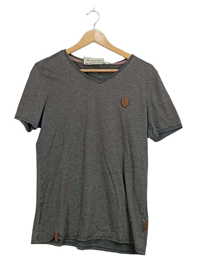 Herren T-Shirt Grau Meliert Gr. 46 S V-Ausschnitt Lederdetails Casual