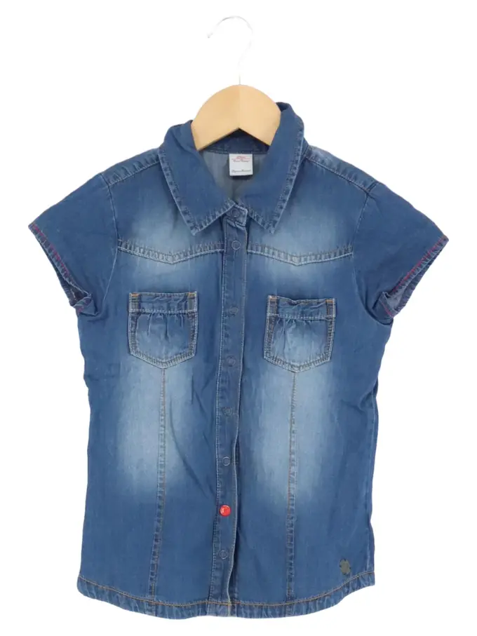 Kinder Bluse Gr. 128 Blau Denim Casual Modisch Schriftzug Kurzarm