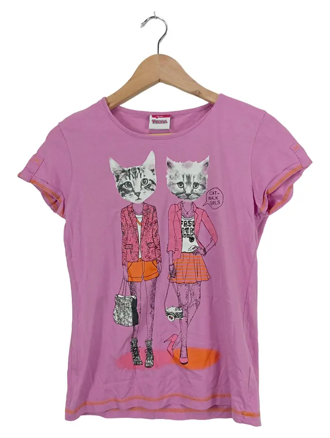 Kinder T-Shirt Rosa Katzenmotiv Gr. 158 Kurzarm Baumwolle Freizeit