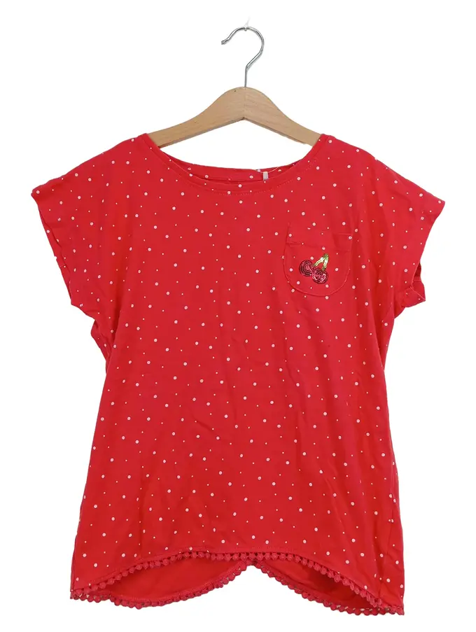 Kinder T-Shirt Rot Gr. 152 Punkte Kirschen Applikation Baumwolle