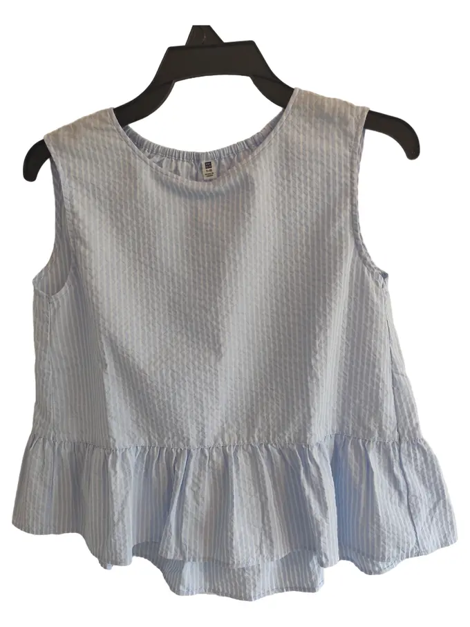 Kinder Top ärmellos Gr. 140 blau gestreift Rüschen Baumwolle