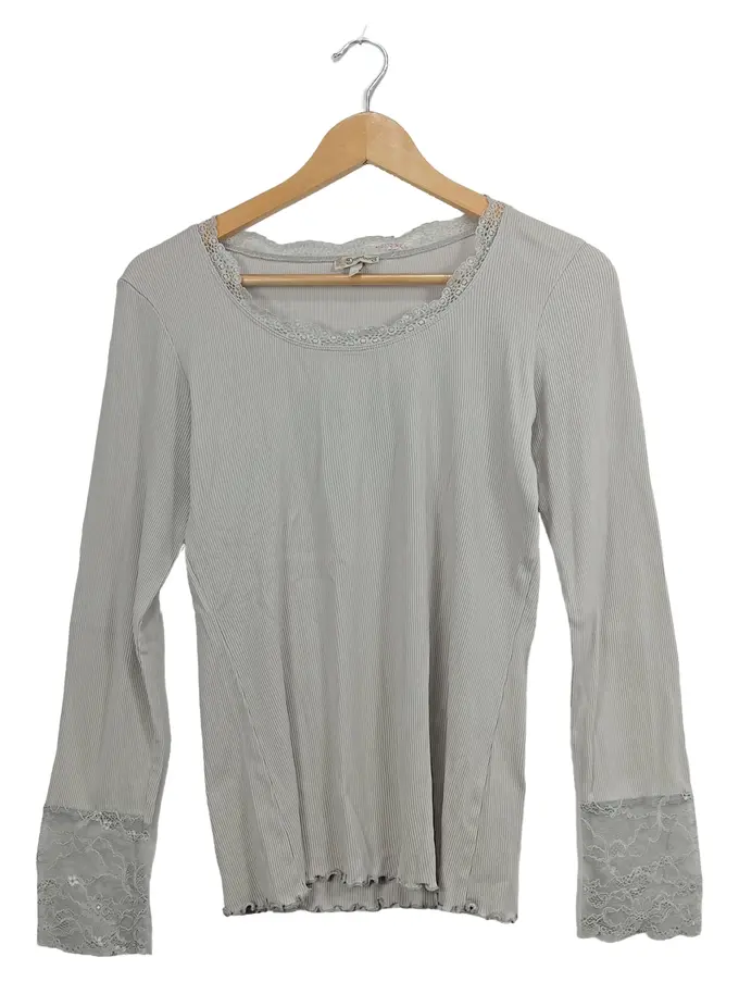 Langarmshirt Damen Gr. 38 M Grau Spitze Rippstrick Baumwolle Shirt