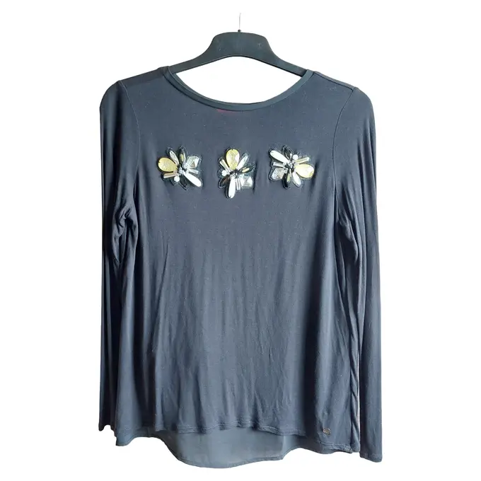 Langarmshirt Damen Gr. 42/XL Schwarz Casual Applikationen