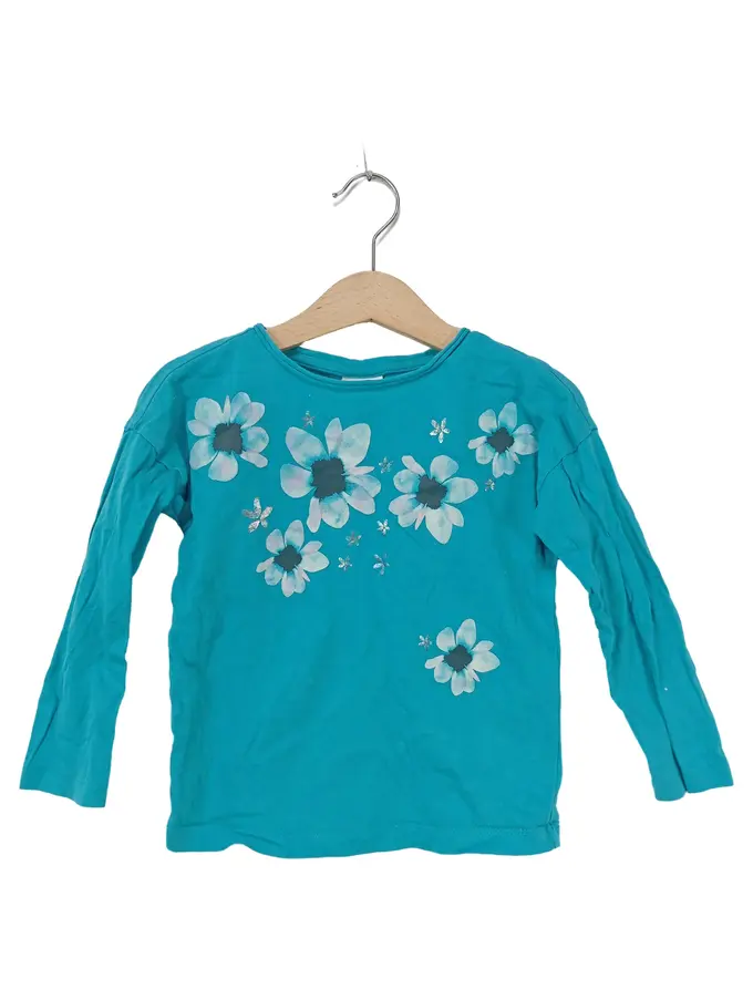 Mädchen Langarmshirt Gr. 92/98 Türkis Blumen Glitzer Baumwolle