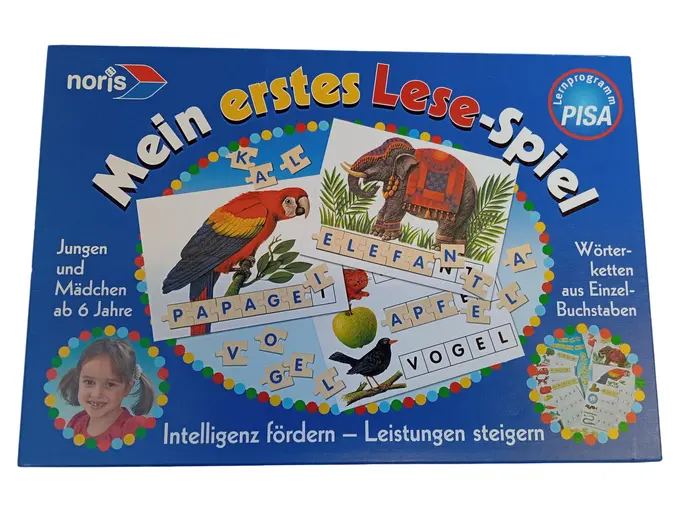 Mein erstes Lese-Spiel" von Noris ist ein Lernprogramm, das Kindern ab 6 Jahren den Einstieg ins Lesenlernen erleichtert und die Intelligenz fördert. Durch 9 wunderschön gezeichnete Bild-Wort-Tafeln und 150 Buchstabenplättchen mit Puzzleschnitt lernen Kinder spielerisch, Wörter zu erkennen und nachzulegen. Das Spiel ist systematisch aufgebaut und führt vom ganzheitlichen Erfassen von Wortbildern bis zum selbstständigen Erlesen kleiner Geschichten. Die ausführliche Spielanleitung bietet 10 Spielv