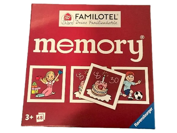 Dieses Ravensburger Memory ist eine exklusive Sonderausgabe zum 30-jährigen Jubiläum von Familotel. Das Spiel beinhaltet 48 Karten mit fröhlichen, kindgerechten Motiven wie spielenden Kindern und Geburtstagstorten. Kinder ab 3 Jahren trainieren hierbei spielerisch ihr Gedächtnis und ihre Konzentration. Ein schönes Mitbringsel für kleine Hotelgäste und Memory-Fans.