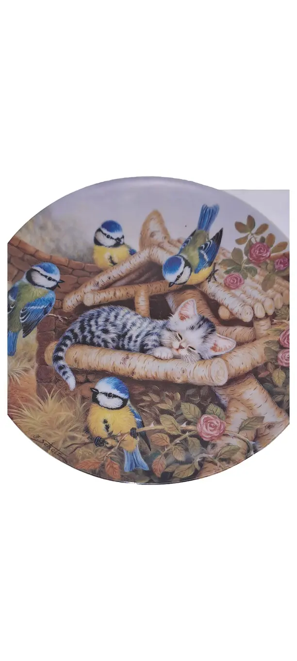 Nickerlchen im Vogelhäuschen Wandteller Katze Vogel Keramik 21cm