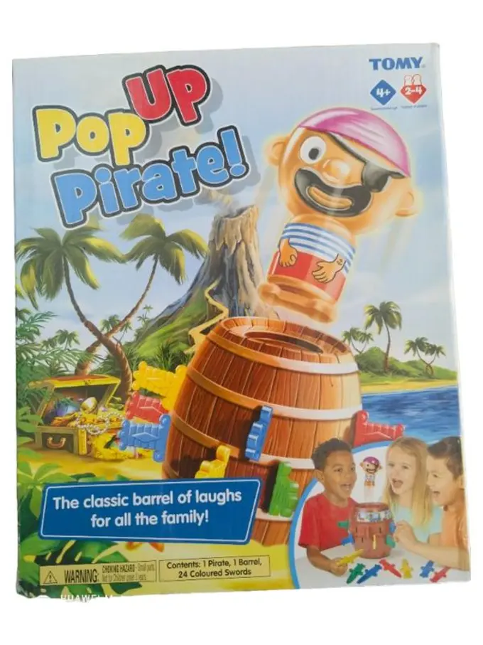 Pop Up Pirate ist ein spannendes Aktionsspiel für die ganze Familie. Die Spieler stecken abwechselnd bunte Schwerter in ein Fass, in dem ein Pirat steckt. Wer das falsche Loch trifft, lässt den Piraten aus dem Fass springen und verliert. Ein lustiges Geschicklichkeitsspiel mit Überraschungseffekt für 2-4 Spieler ab 4 Jahren.