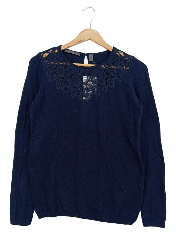 Pullover Damen Gr. 36/S Blau Spitze Langarm Casual