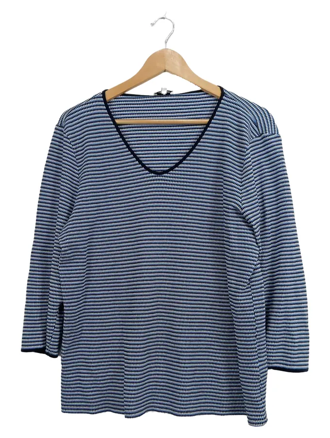 Pullover Damen Gr. 42 XL Blau Gestreift Baumwolle V-Ausschnitt Strick