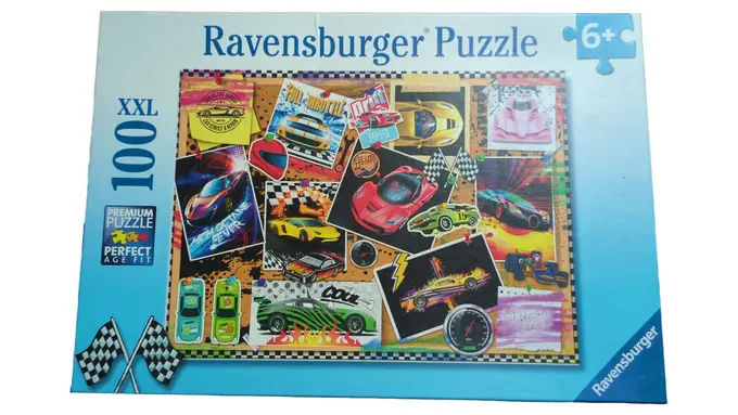 Ravensburger Kinderpuzzle mit 100 XXL-Teilen zeigt coole Sportwagen und Rennwagen für kleine Autofans ab 6 Jahren.
