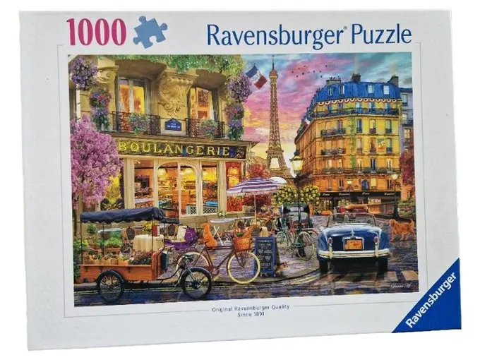 Ravensburger 1000-Teile-Puzzle mit romantischer Pariser Straßenszene – Boulangerie, Eiffelturm & Vintage-Flair.