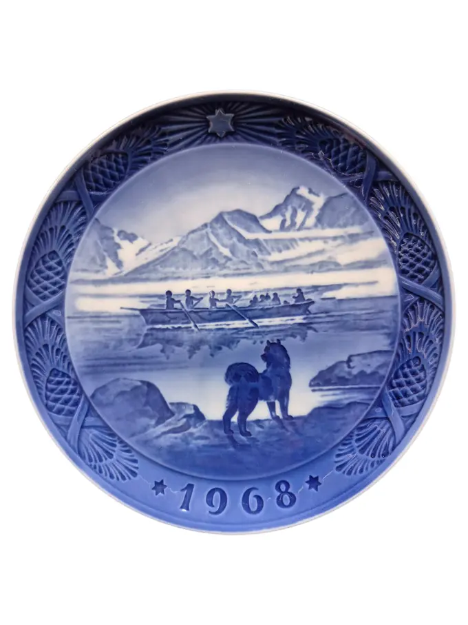 Sammelteller 1968 Hund Ruderboot Berge Porzellan Blau