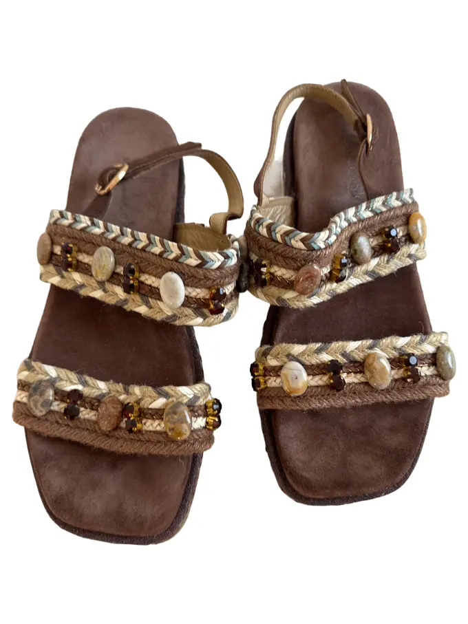 Sandalen Damen Gr. 38 Braun Bohemian Flechtriemen Ziersteine