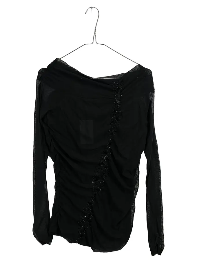 Selection Mesh Shirt Langarm Gr. 40 L Schwarz Perlen Raffung Elegant