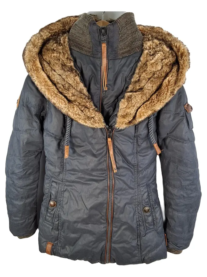 Steppjacke Damen Kapuze Fellbesatz Lederdetails Grau Gr. XS