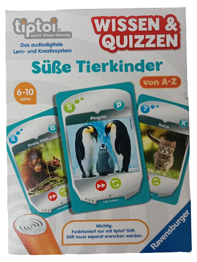 Tauchen Sie ein in die faszinierende Welt der Tierkinder mit dem tiptoi Wissen & Quizzen Spiel von Ravensburger! Dieses audiodigitale Lern- und Kreativsystem macht Wissen lebendig und lädt Kinder von 6 bis 10 Jahren ein, spielerisch die Welt der süßen Tierkinder von A-Z zu entdecken. Mit dem tiptoi Stift (separat erhältlich) können die Kinder auf die Bilder und Texte tippen, um spannende Informationen zu hören, lustige Geräusche zu entdecken und knifflige Quizfragen zu beantworten. Ob Pinguine,